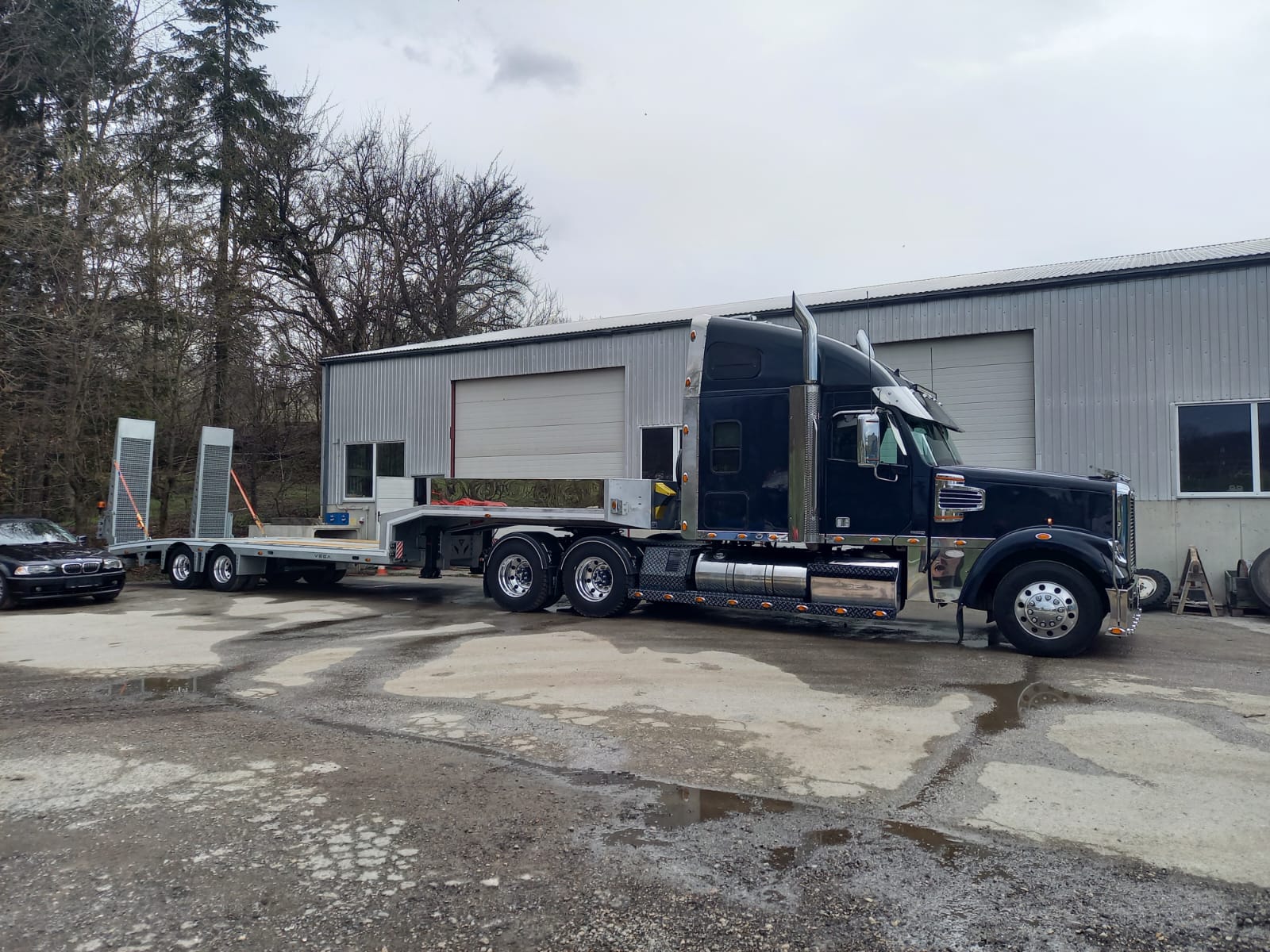 - 3-Achs-Sattelzugmaschine mit Tieflader, perfekt für den Transport von Bau- und Forstgeräten.